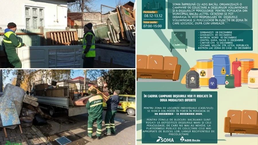În perioada 8-13 decembrie, SOMA, împreună cu ADIS Bacău, organizează o campanie specială pentru colectarea responsabilă a deșeurilor voluminoase și periculoase, adresată locuitorilor din municipiul Bacău, în special celor care trăiesc în zona caselor. Aceasta oferă oportunitatea de a scăpa de obiectele mari și potențial nocive din gospodării.