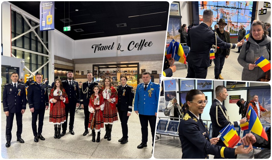 Membrii fanfarei militare a Garnizoanei Bacău au oferit o surpriză plăcută pasagerilor de la Terminalul Sosiri, interpretând Imnul Național al României. Alături de ei, au cântat și Camelia Hroștea împreună cu fiicele sale, creând o atmosferă festivă.