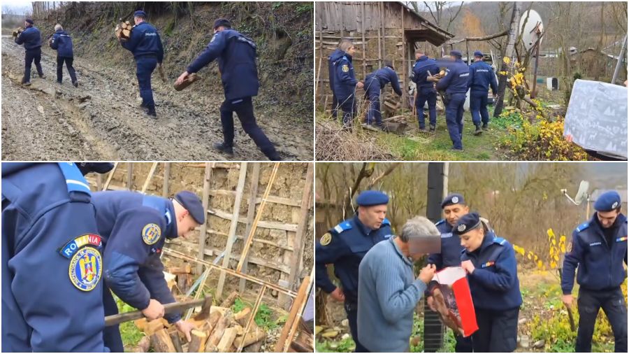 Din cauza faptului că nu se poate ajunge cu mijloacele de transport până la casa bătrânului, jandarmii au cărat lemnele pe jos, purtându-le efectiv în brațe. Apoi au tăiat și aranjat lemnele pentru a-i ușura lui Vasile pregătirea focului în sezonul rece care urmează.