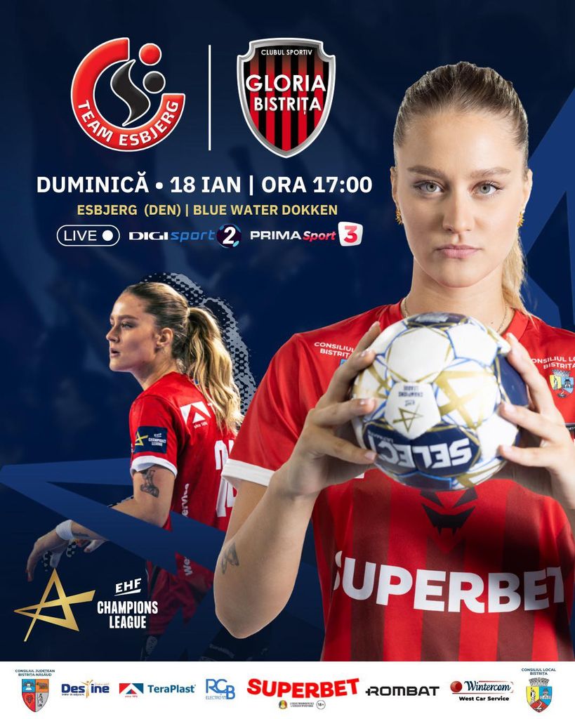 Gloria Bistrița va juca contra Esbjerg duminică, 18 ianuarie, la ora 17:00, într-un meci important din grupa A a competiției europene. Potrivit sursei, partida va fi arbitrată de polonezele Małgorzata Lidaćka și Urszula Lesiak și va fi transmisă în direct pe posturile TV Digi Sport 2 și Prima Sport 3.